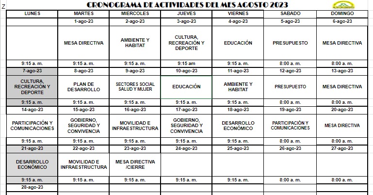 Bogotá 3 de agosto 2023. De acuerdo a la agenda dispuesta por la JAL, este es el cronograma de actividades y temas específicos que sesionaran en el mes de Agosto