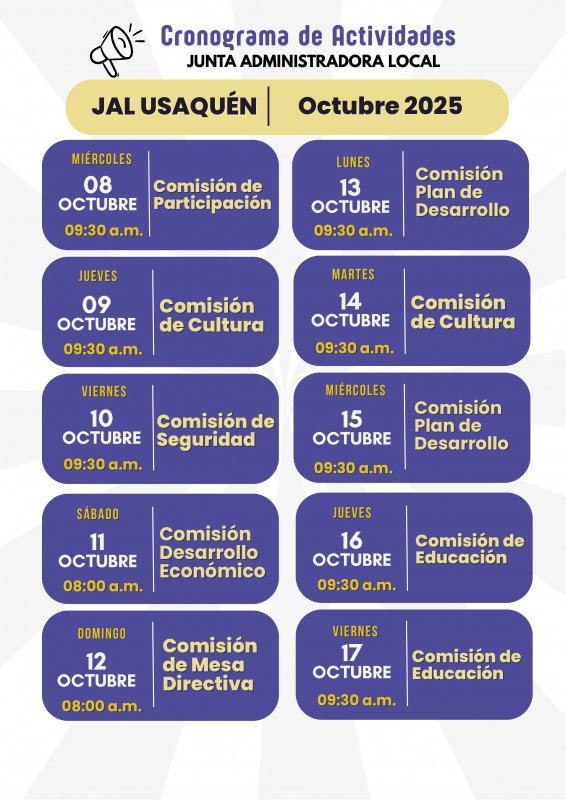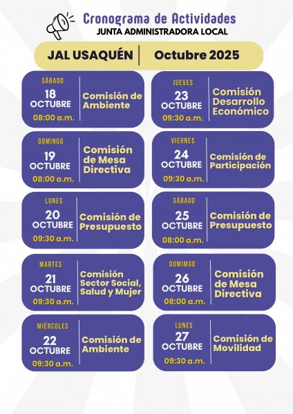 De acuerdo a la agenda dispuesta por la JAL, este es el cronograma de actividades y temas específicos que sesionaran en el mes de octubre.