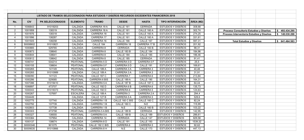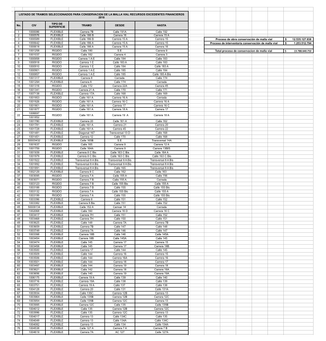 La Alcaldía de Bogotá y la Alcaldía Local de Usaquén, informan los listados de tramos seleccionados para conservación de la malla vial (recursos excedentes financieros), vigencia 2018.