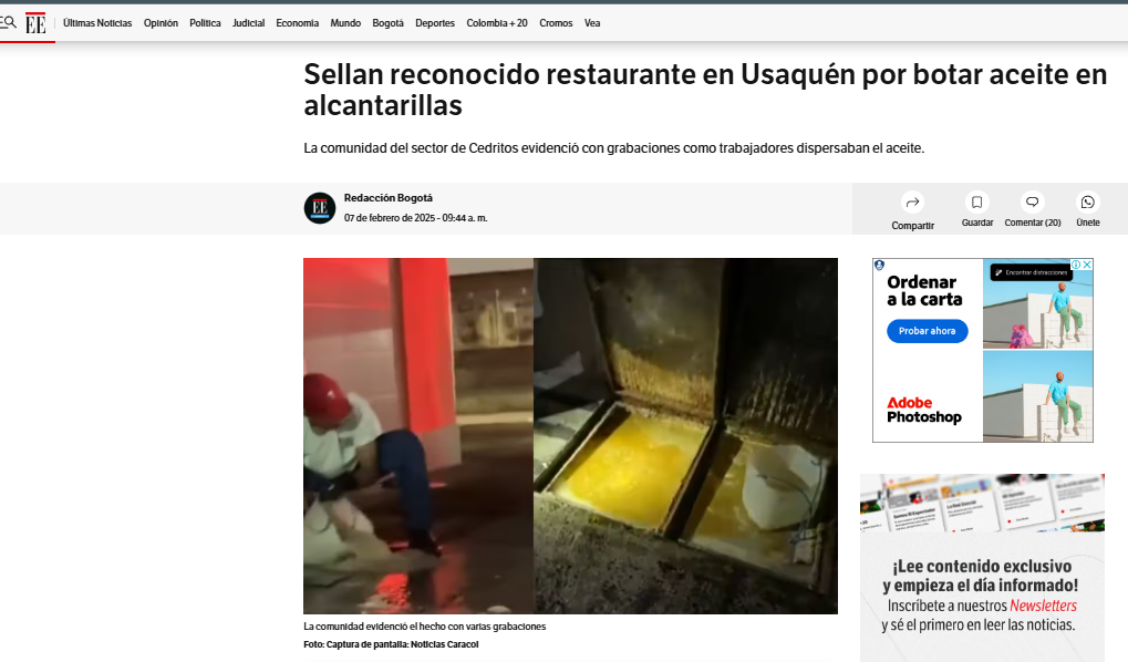 Sellan reconocido restaurante en Usaquén por botar aceite en alcantarillas