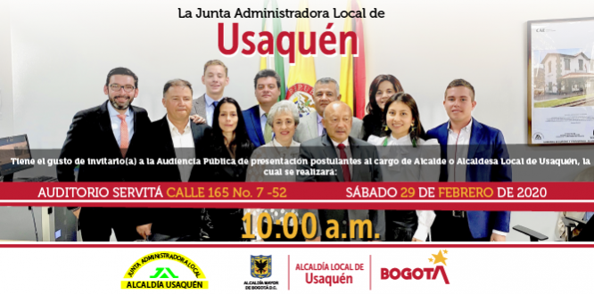 La Junta Administradora Local de Usaquén, invita a los habitantes de la localidad para que asistan a la Audiencia Pública de los 8 candidatos que aspiran a ser Alcalde o Alcaldesa Local de Usaquén. El encuentro se llevará a cabo el próximo sábado 29 de febrero en el Teatro Servitá a las 10:00 a.m.
