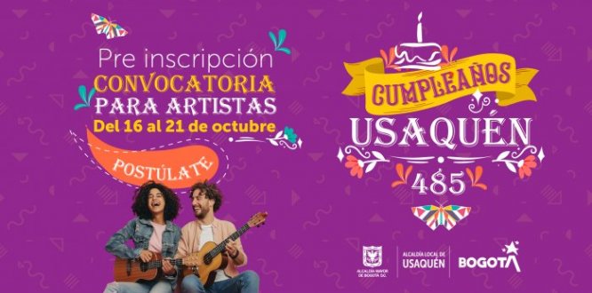 Bogotá D.C., 16 de octubre de 2024. La Alcaldía Local de Usaquén se complace en anunciar la Convocatoria para el Cumpleaños 485 de Usaquén, dirigida a artistas residentes en la localidad. El evento se realizará el domingo 27 de octubre de 2024 en el Teatro Servitá para el cual se seleccionarán 10 muestras que representen la rica historia y cultura de Usaquén. Cada persona seleccionada recibirá un reconocimiento económico de $1.000.000 m/cte., sujeto a las retenciones de ley, y el pago será gestionado por el operador logístico encargado del proceso.